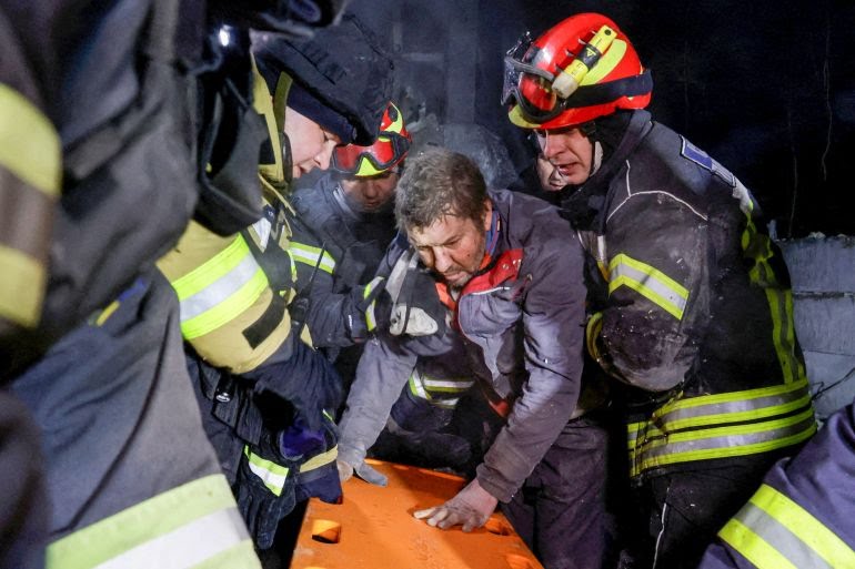 White helmeted emergency workers could be seen clambering through the still-smoking wreckage of a building occupied by postal company Nova Poshta, in a video posted by the regional prosecutor’s office.